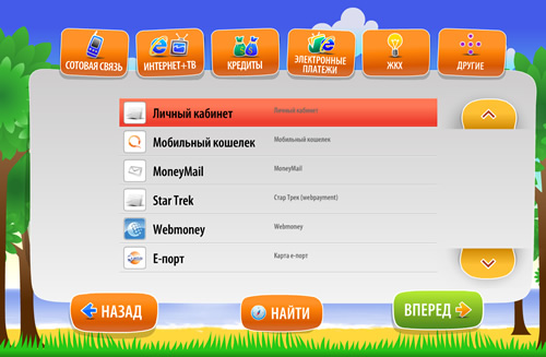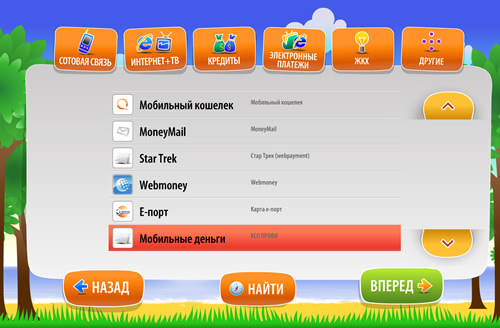 5. Выберете из списка (спуститься вниз на один пункт стрелкой вниз справа) раздел "Мобильные деньги"