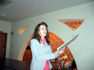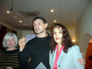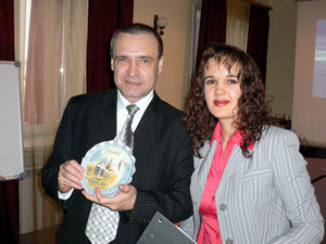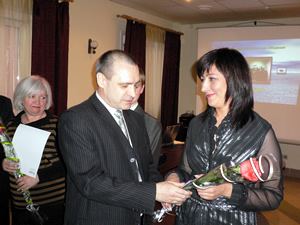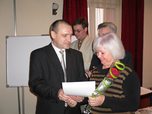 Леонидова Елена вручает памятный подарок Александру Скороходу